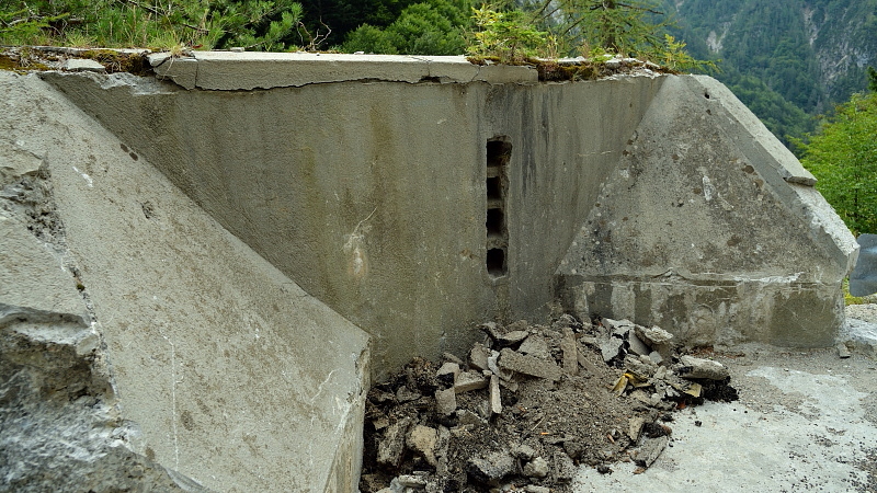 NASSFELDSTRASSE Auf der italienischen Seite in Fahrtrichtung Pontebba verengt sich der Bombaschgraben ungefähr auf halber Strecke der Straße. Hier befindet sich eine Lawinengalerie an deren südlichen Ende ein Betonobjekt steht, offensichtlich der Rest einer Straßensperre. Da man als Autofahrer an dieser Stelle sein Augenmerk auf die Straße richten muss, fiel mir die Kaverne oberhalb erst 2023 auf. |