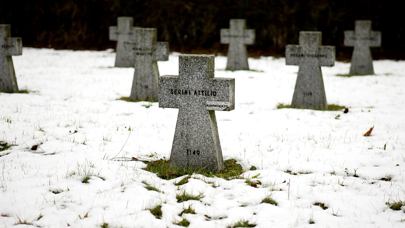 Im Zweiten Weltkrieg gefallene italienische Soldaten sowie KZ-Häftlinge sind ebenfalls hier bestattet. An die Opfer der KZ erinnert ein Holzkreuz mit unten stehender Inschrift: