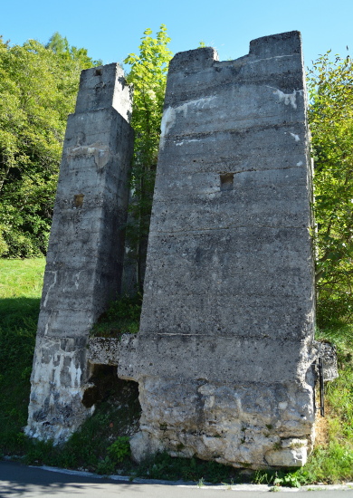 HAUBITZSTELLUNG In Fahrtrichtung bergab befand sich kurz nach der Implanz-Stellung eine 280mm Haubitze: |