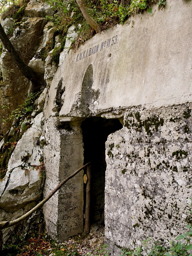 | Erstaunlich, dass man trotz intensiver Kampfhandlungen die Zeit fand, die Stellungen auch ansprechend, mit Liebe zum Detail zu gestalten, wie hier das Portal eines Wasserbehälters (Baukomp. 10/Ldw.19.) der an ein ägyptisches Grabmal erinnert (Foto oben links). Spannend ist es auch, wenn der Rundweg durch die Kavernen führt (Foto oben rechts). | ||